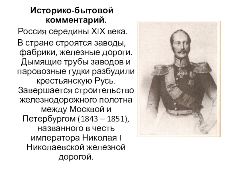 железные дороги. Дымящие трубы заводов и паровозные гудки разбудили крестьянскую Русь. Завершается строительство железнодорожного полотна между Москвой и Петербургом (1843 – 1851), названного в честь императора Николая I Николаевской железной дорогой.
