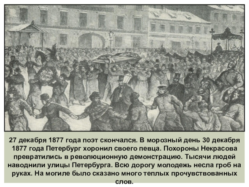 1877 года Петербург хоронил своего певца. Похороны Некрасова превратились в революционную демонстрацию. Тысячи людей наводнили улицы Петербурга. Всю дорогу молодежь несла гроб на руках. На могиле было сказано много теплых прочувствованных слов.