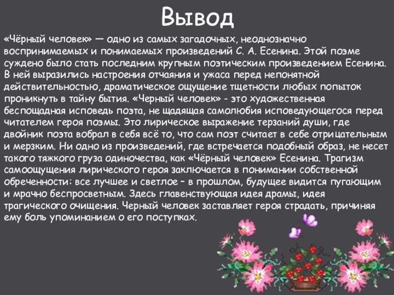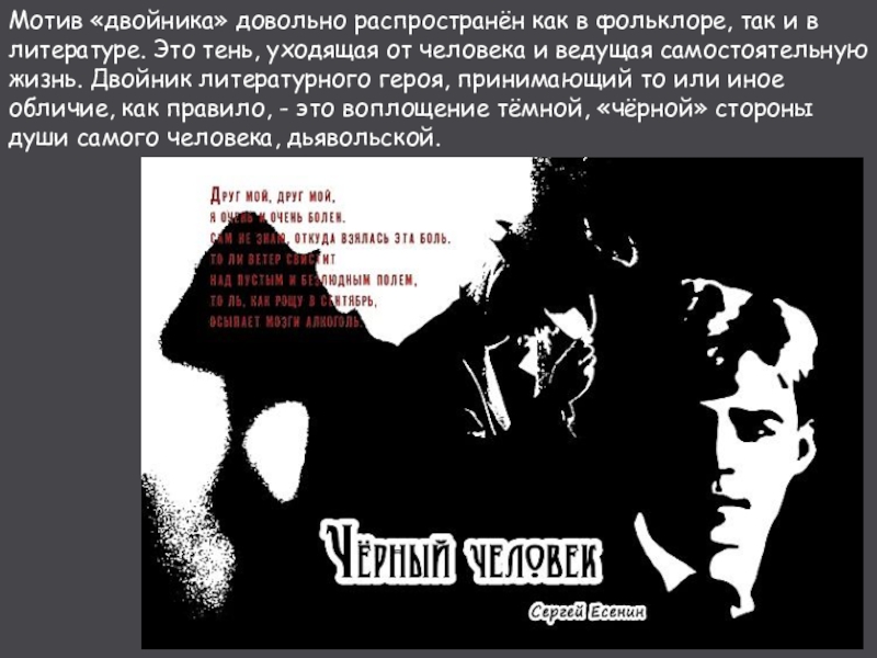 произведений С. А. Есенина. Этой поэме суждено было стать последним крупным поэтическим произведением Есенина. В ней выразились настроения отчаяния и ужаса перед непонятной действительностью, драматическое ощущение тщетности любых попыток проникнуть в тайну бытия. «Черный человек» - это художественная беспощадная исповедь поэта, не щадящая самолюбия исповедующегося перед читателем героя поэмы. Это лирическое выражение терзаний души, где двойник поэта вобрал в себя всё то, что сам поэт считает в себе отрицательным и мерзким. Ни одно из произведений, где встречается подобный образ, не несет такого тяжкого груза одиночества, как «Чёрный человек» Есенина. Трагизм самоощущения лирического героя заключается в понимании собственной обреченности: все лучшее и светлое – в прошлом, будущее видится пугающим и мрачно беспросветным. Здесь главенствующая идея драмы, идея трагического очищения. Черный человек заставляет героя страдать, причиняя ему боль упоминанием о его поступках.