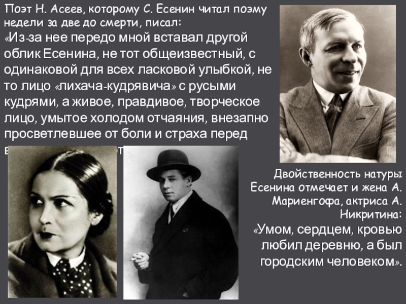Двойственность натуры Есенина отмечает и жена А. Мариенгофа, актриса А. Никритина: