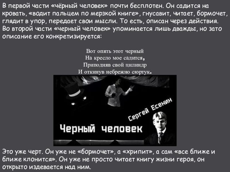 Слайд 19В первой части «чёрный человек» почти бесплотен. Он садится на кровать,