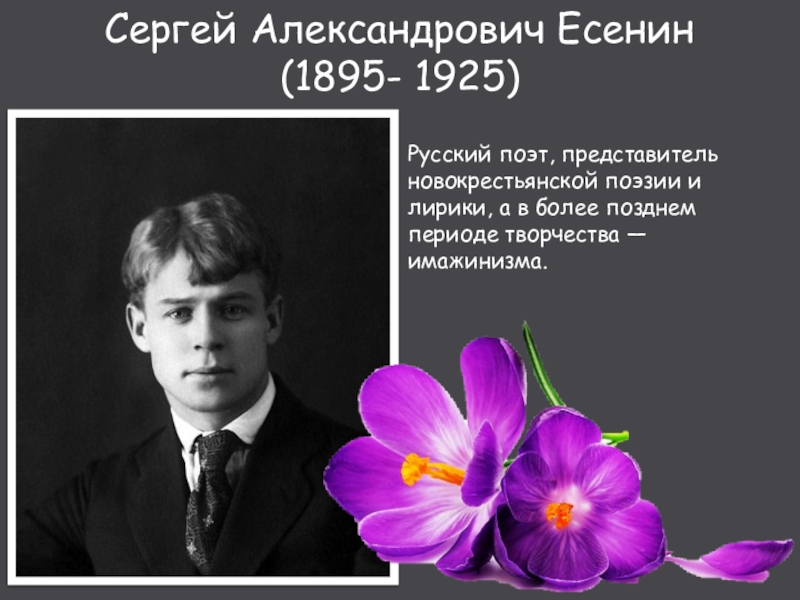 тонкий лирик, мастер глубоко пейзажа, певец крестьянской Руси, знаток народного языка и народной души. В 1919—1923 годах входил в группу имажинистов. Трагическое мироощущение, душевное смятение выражены в циклах «Кобыльи корабли» (1920), «Москва кабацкая» (1924), поэме «Чёрный человек» (1925).