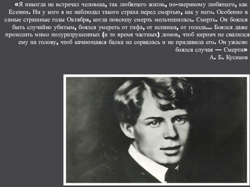 Есенин. Ни у кого я не наблюдал такого страха перед смертью, как у него. Особенно в самые страшные годы Октября, когда повсюду смерть мельтешилась. Смерть. Он боялся быть случайно убитым, боялся умереть от тифа, от испанки, от голода... Боялся даже проходить мимо полуразрушенных (в то время частных) домов, чтоб кирпич не свалился ему на голову, чтоб качающаяся балка не сорвалась и не придавила его. Он ужасно боялся случая — Смерти»