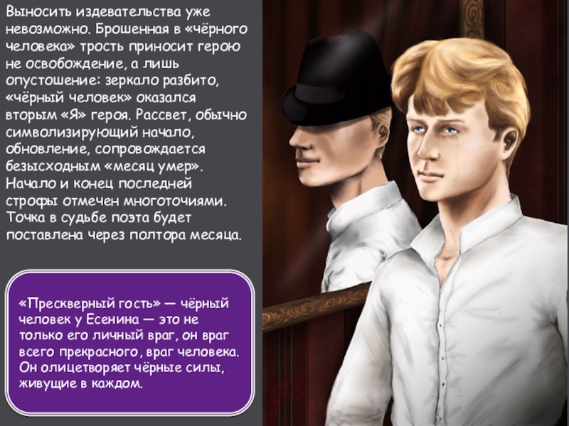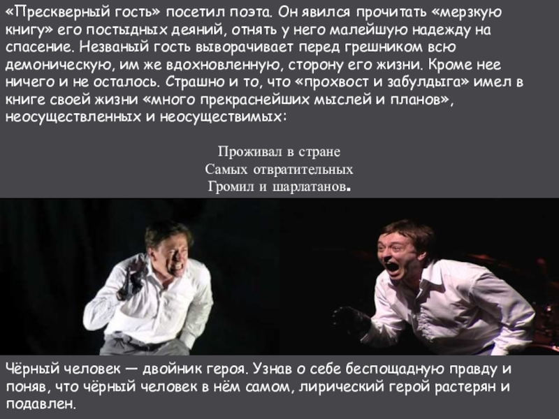 «Прескверный гость» — чёрный человек у Есенина — это не только его личный враг, он враг всего прекрасного, враг человека. Он олицетворяет чёрные силы, живущие в каждом.