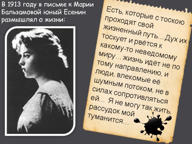 Слайд 8В 1913 году в письме к Марии Бальзамовой юный Есенин размышлял