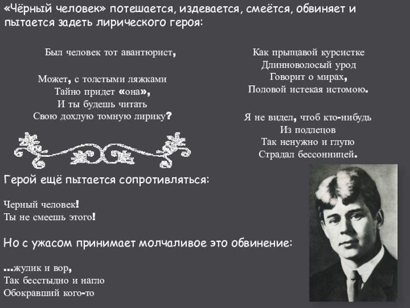 «Чёрный человек» потешается, издевается, смеётся, обвиняет и пытается задеть лирического героя:
