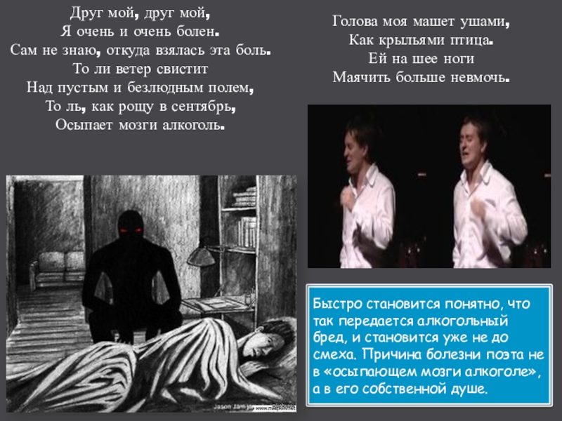 Быстро становится понятно, что так передается алкогольный бред, и становится уже не до смеха. Причина болезни поэта не в «осыпающем мозги алкоголе», а в его собственной душе.