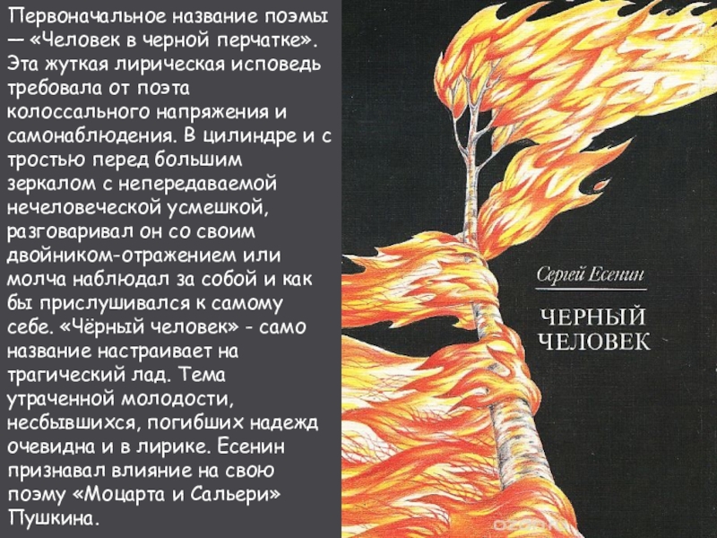 исповедь требовала от поэта колоссального напряжения и самонаблюдения. В цилиндре и с тростью перед большим зеркалом с непередаваемой нечеловеческой усмешкой, разговаривал он со своим двойником-отражением или молча наблюдал за собой и как бы прислушивался к самому себе. «Чёрный человек» - само название настраивает на трагический лад. Тема утраченной молодости, несбывшихся, погибших надежд очевидна и в лирике. Есенин признавал влияние на свою поэму «Моцарта и Сальери» Пушкина.