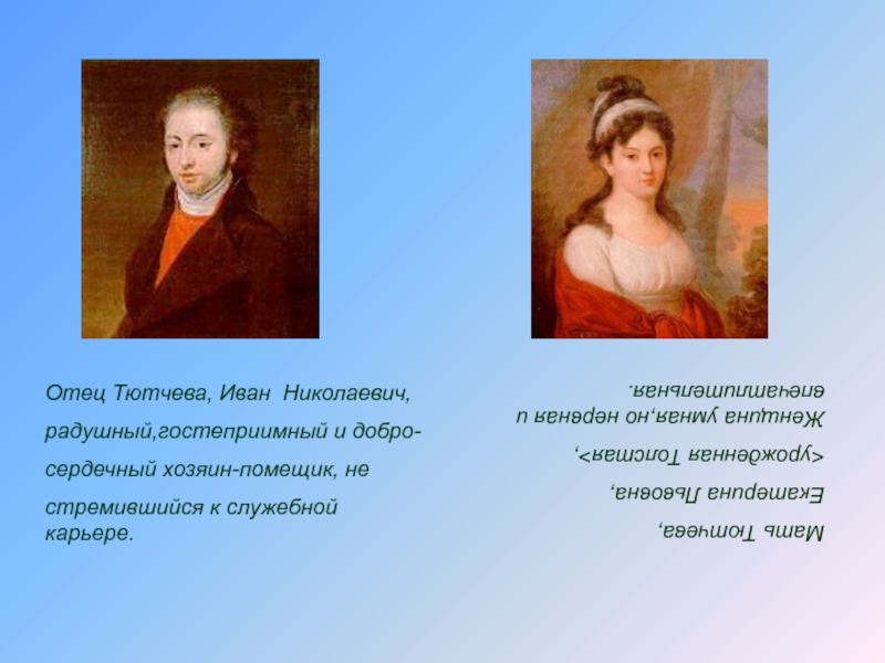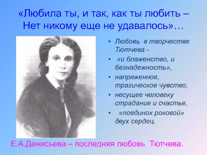 В 1839 г., после смерти первой жены, Тютчев заключает брак с красавицей Эрнестиной Дернберг,урожденной баронессой Пфеффель.