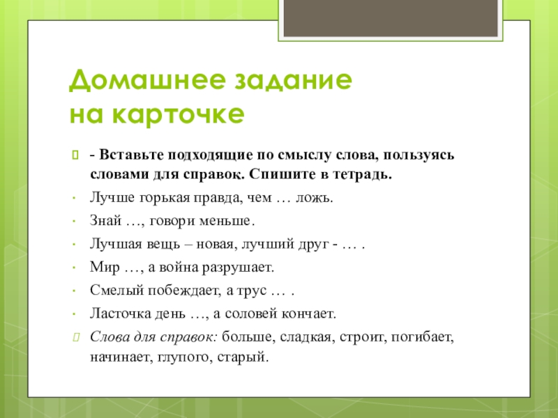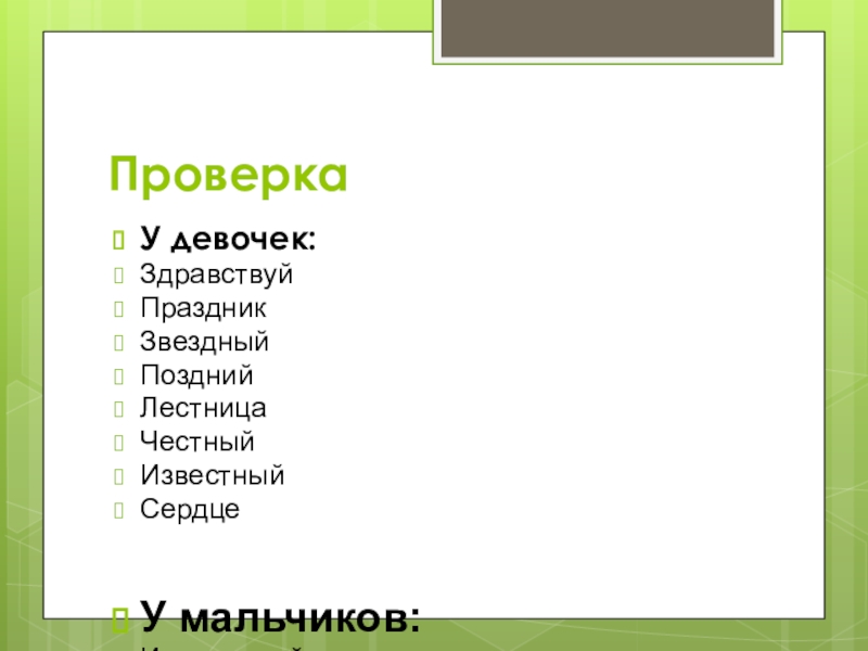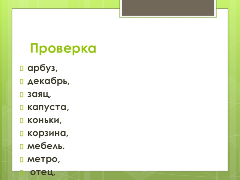 Д..кабрь, к..пуста, ..рбуз, за..ц, к..ньки, к..рзина, ..тец, м..тро, р..сунок, п..суда, м..бель.