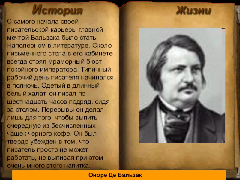 С самого начала своей писательской карьеры главной мечтой Бальзака было стать Наполеоном в литературе. Около письменного стола в его кабинете всегда стоял мраморный бюст покойного императора. Типичный рабочий день писателя начинался в полночь. Одетый в длинный белый халат, он писал по шестнадцать часов подряд, сидя за столом. Перерывы он делал лишь для того, чтобы выпить очередную из бесчисленных чашек черного кофе. Он был твердо убежден в том, что писатель просто не может работать, не выпивая при этом очень много этого напитка.