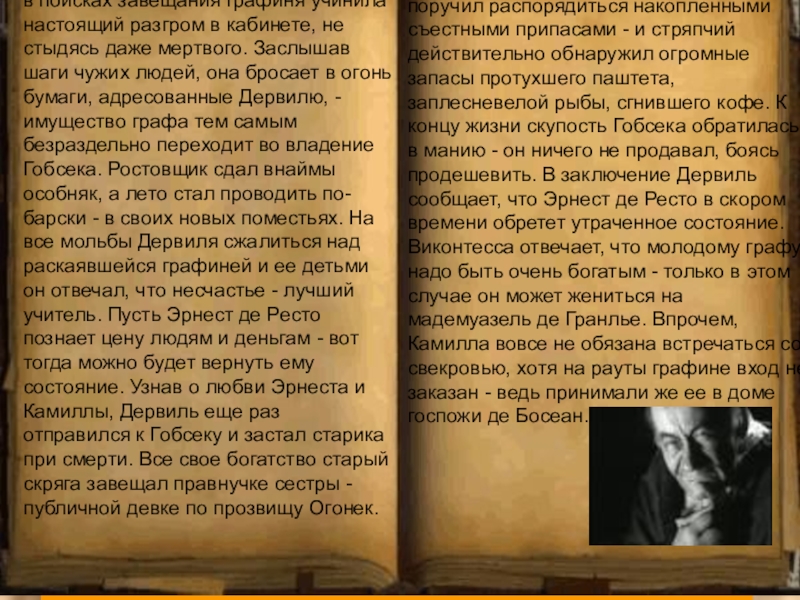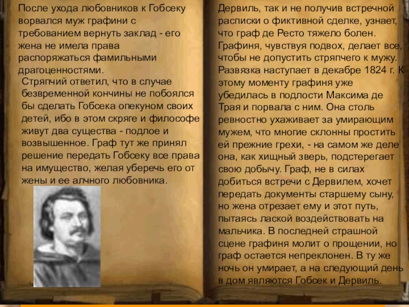 Повесть (1830-1835) Историю ростовщика Гобсека стряпчий Дервиль рассказывает в салоне виконтессы де Гранлье - одной из самых знатных и богатых дам в аристократическом Сен-Жерменском предместье.