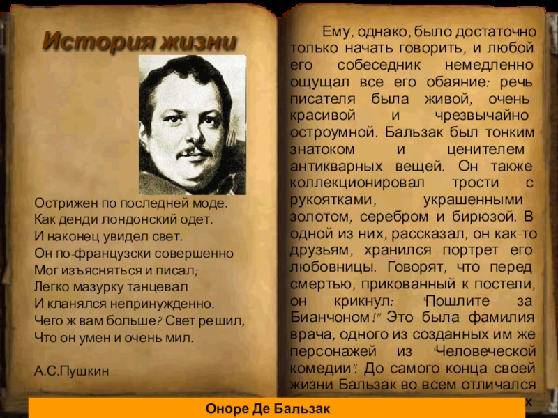 Ему, однако, было достаточно только начать говорить, и любой его собеседник немедленно ощущал все его обаяние: речь писателя была живой, очень красивой и чрезвычайно остроумной. Бальзак был тонким знатоком и ценителем антикварных вещей. Он также коллекционировал трости с рукоятками, украшенными золотом, серебром и бирюзой. В одной из них, рассказал, он как-то друзьям, хранился портрет его любовницы. Говорят, что перед смертью, прикованный к постели, он крикнул: "Пошлите за Бианчоном!" Это была фамилия врача, одного из созданных им же персонажей из "Человеческой комедии". До самого конца своей жизни Бальзак во всем отличался от остальных: из всех великих писателей, которые умерли от напитков, он стал, вероятно, единственным, для кого фатальным оказался не алкоголь, а кофе.