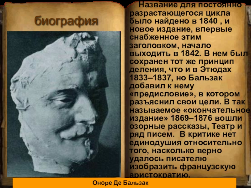 Название для постоянно разрастающегося цикла было найдено в 1840 , и новое издание, впервые снабженное этим заголовком, начало выходить в 1842. В нем был сохранен тот же принцип деления, что и в Этюдах 1833–1837, но Бальзак добавил к нему «предисловие», в котором разъяснил свои цели. В так называемое «окончательное издание» 1869–1876 вошли озорные рассказы, Театр и ряд писем. В критике нет единодушия относительно того, насколько верно удалось писателю изобразить французскую аристократию.