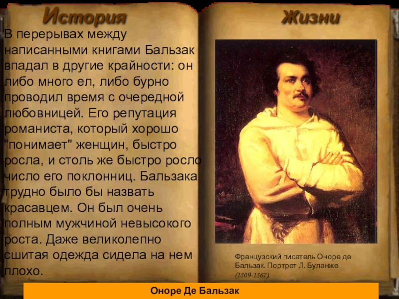 В перерывах между написанными книгами Бальзак впадал в другие крайности: он либо много ел, либо бурно проводил время с очередной любовницей. Его репутация романиста, который хорошо "понимает" женщин, быстро росла, и столь же быстро росло число его поклонниц. Бальзака трудно было бы назвать красавцем. Он был очень полным мужчиной невысокого роста. Даже великолепно сшитая одежда сидела на нем плохо.