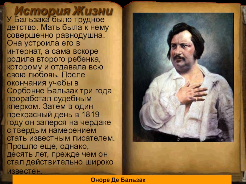 У Бальзака было трудное детство. Мать была к нему совершенно равнодушна. Она устроила его в интернат, а сама вскоре родила второго ребенка, которому и отдавала всю свою любовь. После окончания учебы в Сорбонне Бальзак три года проработал судебным клерком. Затем в один прекрасный день в 1819 году он заперся на чердаке с твердым намерением стать известным писателем. Прошло еще, однако, десять лет, прежде чем он стал действительно широко известен.