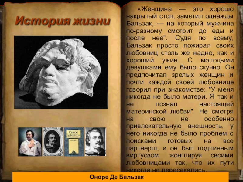 «Женщина — это хорошо накрытый стол, заметил однажды Бальзак, — на который мужчина по-разному смотрит до еды и после нее". Судя по всему, Бальзак просто пожирал своих любовниц столь же жадно, как и хороший ужин. С молодыми девушками ему было скучно. Он предпочитал зрелых женщин и почти каждой своей любовнице говорил при знакомстве: "У меня никогда не было матери. Я так и не познал настоящей материнской любви". Не смотря на свою не особенно привлекательную внешность, у него никогда не было проблем с поисками готовых на все партнерш, и он был подлинным виртуозом, жонглируя своими любовницами так, что их пути никогда не пересекались.