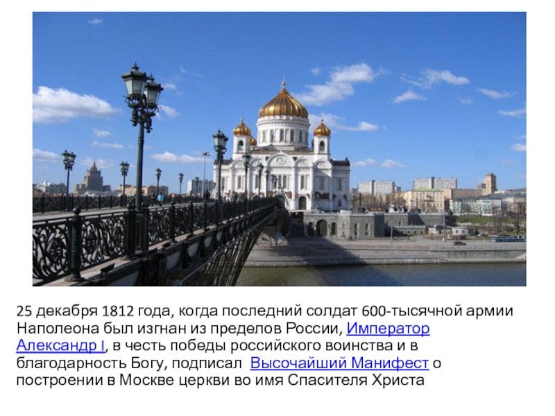 за заступничество Всевышнего в критический период истории России как памятник мужеству русского народа в борьбе с наполеоновским нашествием 1812 года.