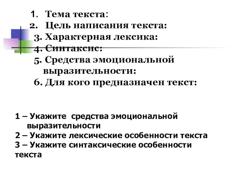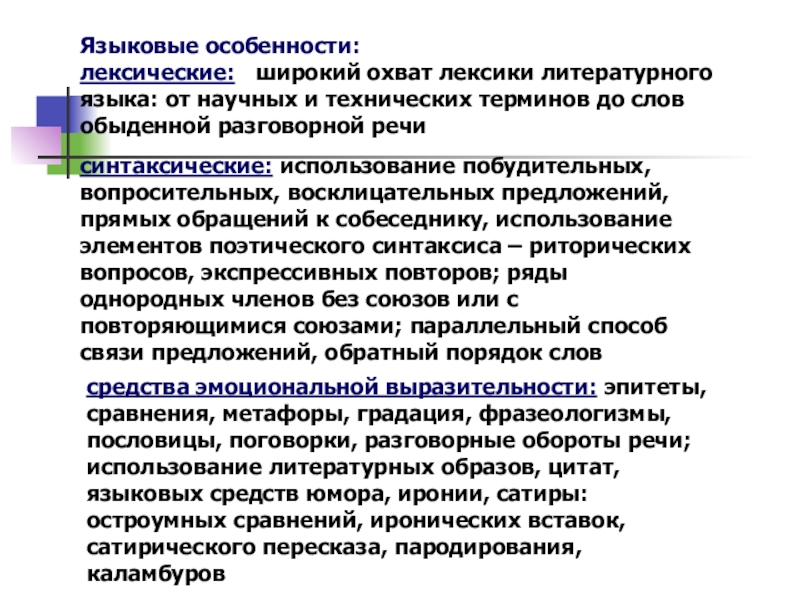 синтаксические: использование побудительных, вопросительных, восклицательных предложений, прямых обращений к собеседнику, использование элементов поэтического синтаксиса – риторических вопросов, экспрессивных повторов; ряды однородных членов без союзов или с повторяющимися союзами; параллельный способ связи предложений, обратный порядок слов