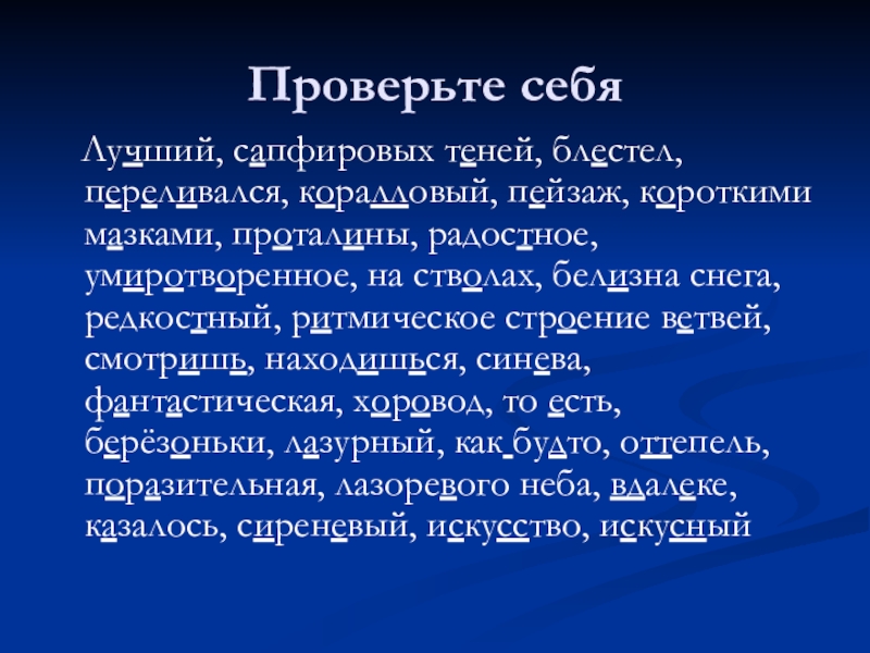 мозками, проталены,радосное,умератворенное,на ствалах, белезна снега, редкосный, ретмическое страение ветвей, смотреш, находишся,синива, фантостическая, харовод, тоисть, берёзаньки, лозурный, кагбутто, одтепель, парозительная, лазорегого неба, вдалике, козалось, сереневый, искуство, искустный