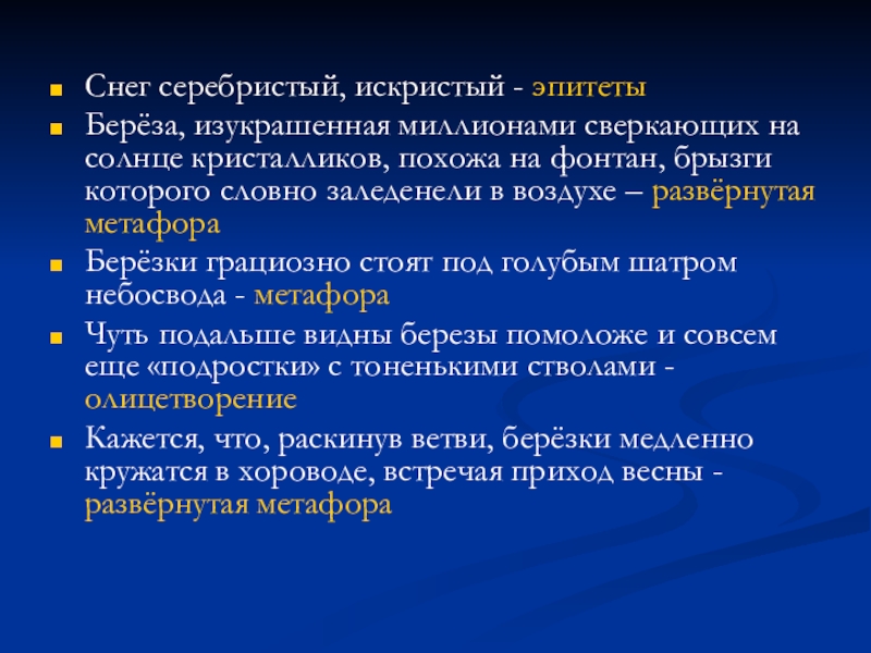 Слайд 21Снег серебристый, искристый - эпитеты