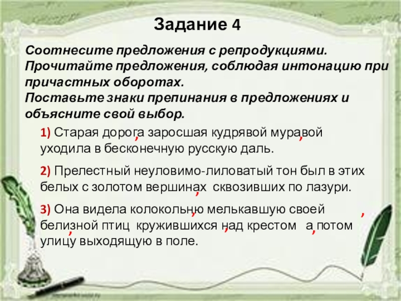 3) Она видела колокольню мелькавшую своей белизной птиц кружившихся над крестом а потом улицу выходящую в поле.