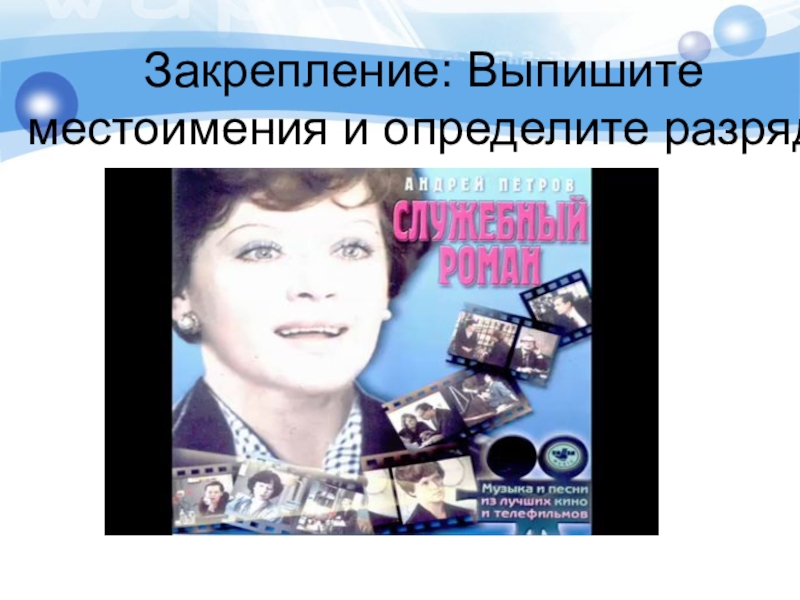 Слайд 33Закрепление: Выпишите местоимения и определите разряд