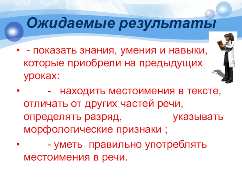 - находить местоимения в тексте, отличать от других частей речи, определять разряд, указывать морфологические признаки ;
