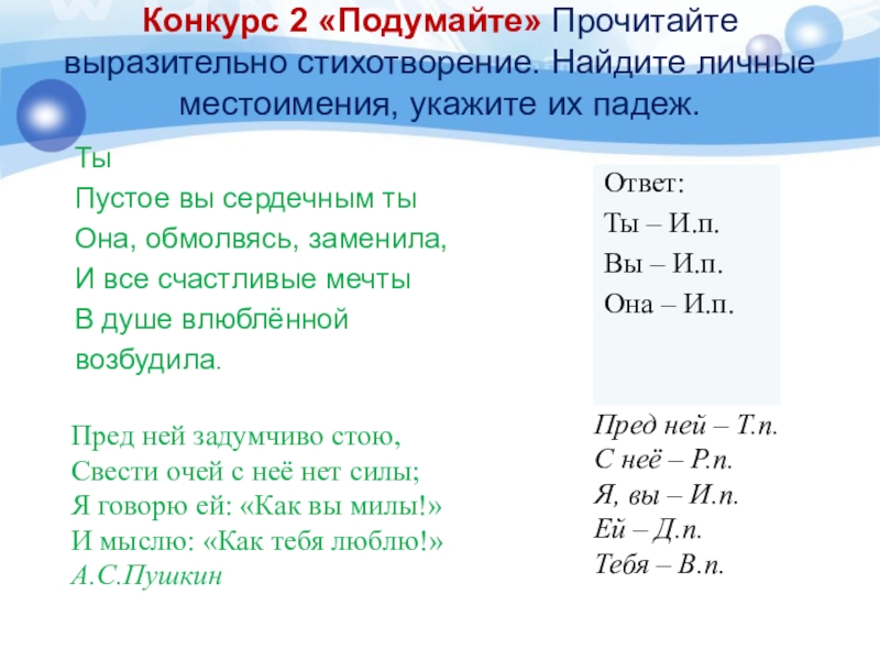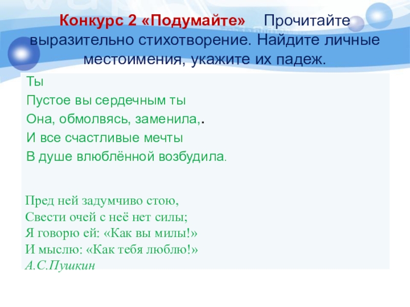 Слайд 14Конкурс 2 «Подумайте» Прочитайте выразительно стихотворение. Найдите личные местоимения, укажите их падеж.