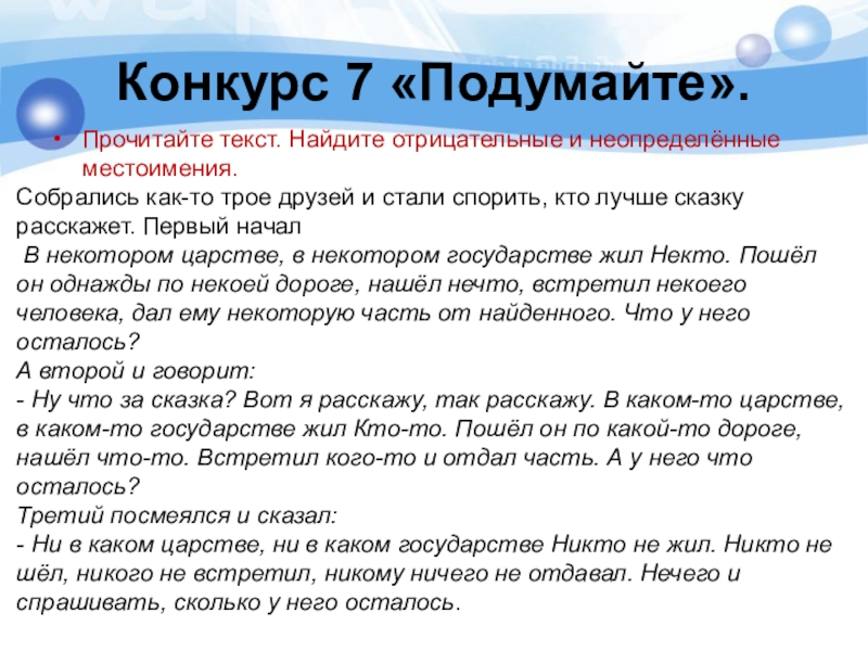 В некотором царстве, в некотором государстве жил Некто. Пошёл он однажды по некоей дороге, нашёл нечто, встретил некоего человека, дал ему некоторую часть от найденного. Что у него осталось?