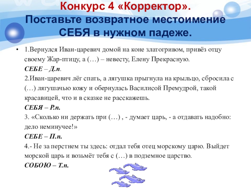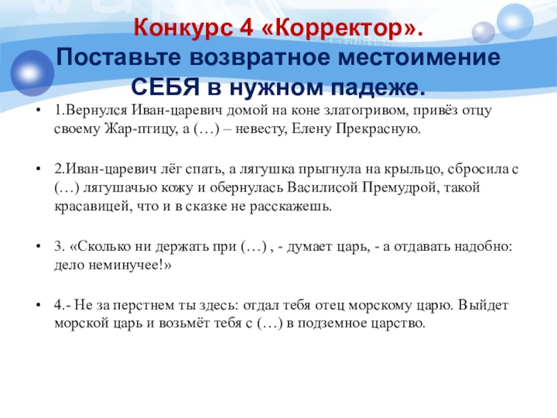 2.Иван-царевич лёг спать, а лягушка прыгнула на крыльцо, сбросила с (…) лягушачью кожу и обернулась Василисой Премудрой, такой красавицей, что и в сказке не расскажешь.
