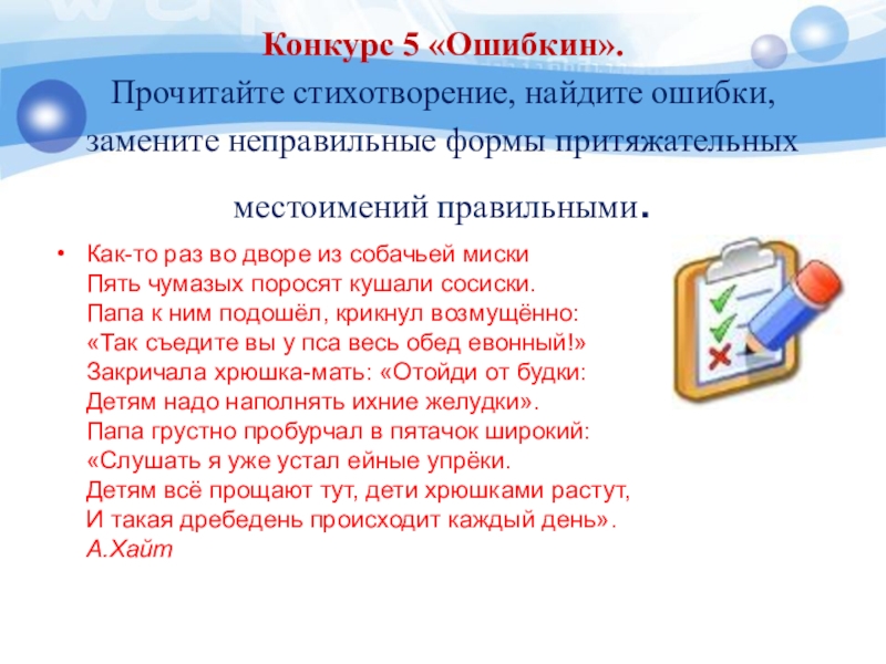 Прочитайте стихотворение, найдите ошибки, замените неправильные формы притяжательных местоимений