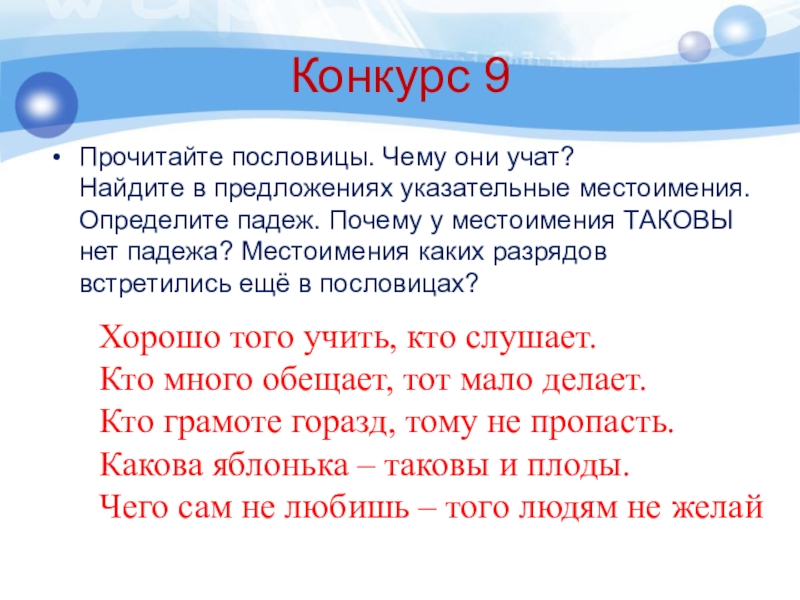 падеж. Почему у местоимения ТАКОВЫ нет падежа? Местоимения каких разрядов встретились ещё в пословицах?