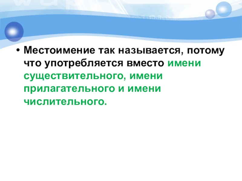 Слайд 8Местоимение так называется, потому что употребляется вместо имени существительного, имени прилагательного