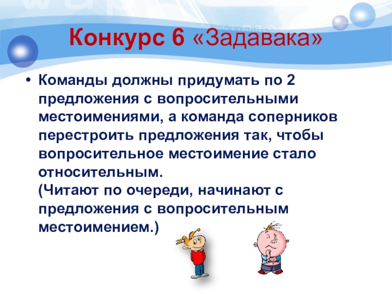 Команды должны придумать по 2 предложения с вопросительными местоимениями,