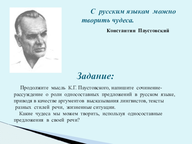 Продолжите мысль К.Г. Паустовского, напишите сочинение-рассуждение о роли односоставных предложений в русском языке, приводя в качестве аргументов высказывания лингвистов, тексты