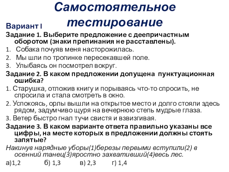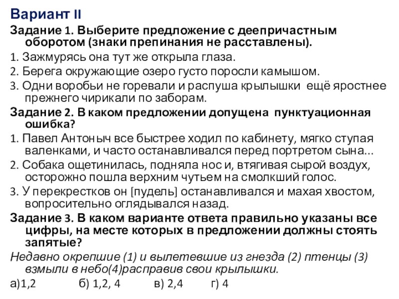 Задание 1. Выберите предложение с деепричастным оборотом (знаки препинания