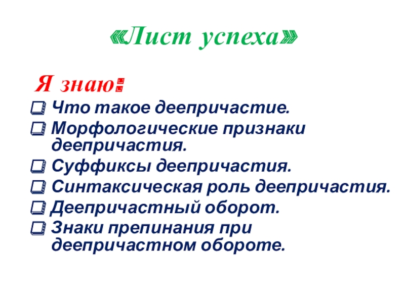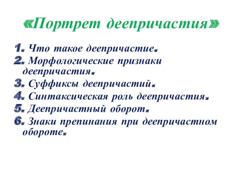добавочное действие к основному, выраженному глаголом-сказуемым. Отвечает на вопросы: что делая? что сделав? как? каким образом? и имеет признаки глагола (вид, возвратность, переходность) и наречия (неизменяемость). Образуются деепричастия от глаголов с помощью суффиксов – а, –я, – в, – ши, – вши.