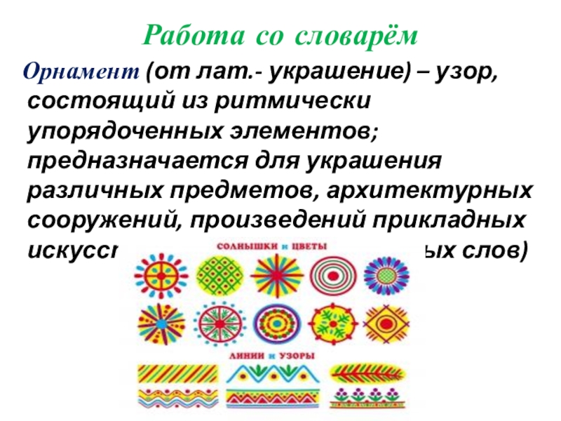 ритмически упорядоченных элементов; предназначается для украшения различных предметов, архитектурных сооружений, произведений прикладных искусств. (Словарь иностранных слов)