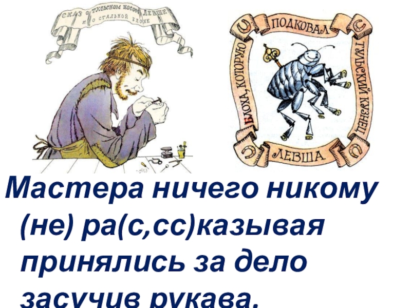 Слайд 11Мастера ничего никому (не) ра(с,сс)казывая принялись за дело засучив рукава.