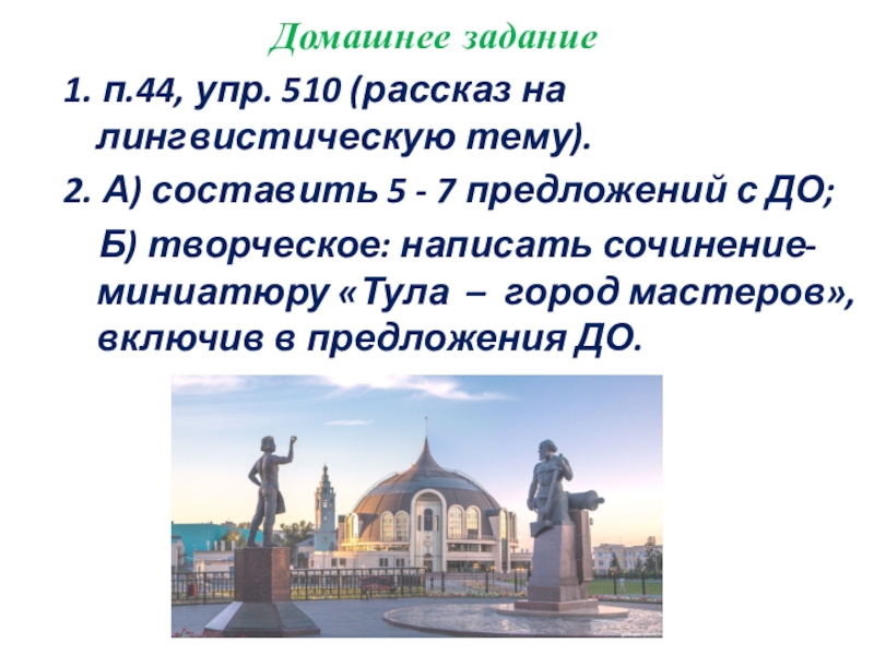 Б) творческое: написать сочинение-миниатюру «Тула – город мастеров», включив в предложения ДО.