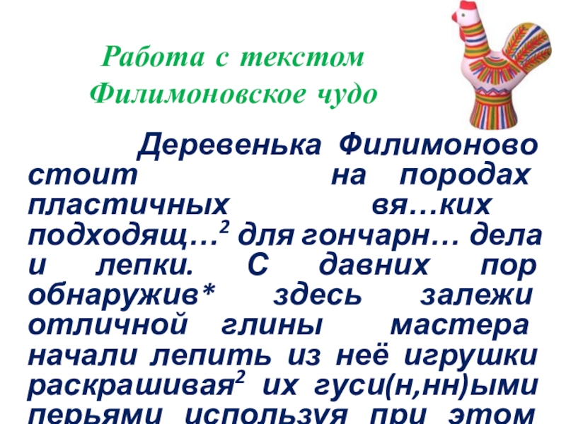 на породах пластичных вя…ких подходящ…2 для гончарн… дела и лепки. С давних пор обнаружив* здесь залежи отличной глины мастера начали лепить из неё игрушки раскрашивая2 их гуси(н,нн)ыми перьями используя при этом древний орнамент5.