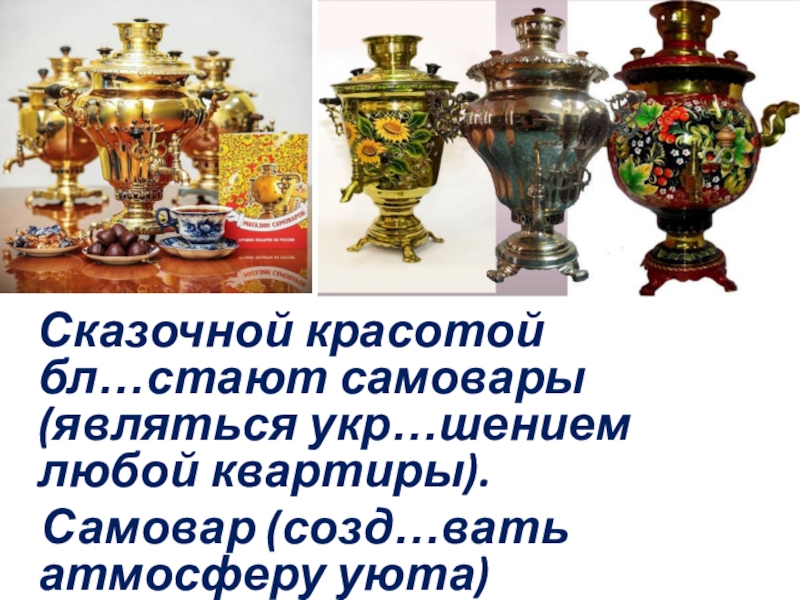 Слайд 10 Сказочной красотой бл…стают самовары (являться укр…шением любой квартиры).