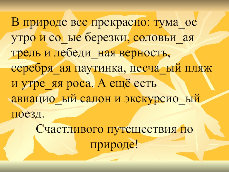 В природе все прекрасно: тума_ое утро и со_ые березки, соловьи_ая трель и лебеди_ная верность, серебря_ая паутинка, песча_ый пляж и утре_яя роса. А ещё есть авиацио_ый салон и экскурсио_ый поезд.Счастливого путешествия по природе!