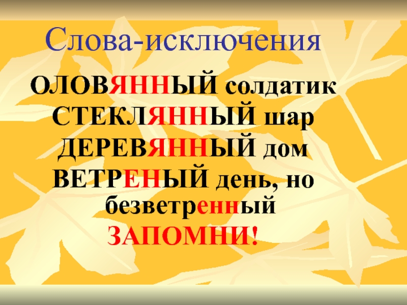 Слова-исключенияОЛОВЯННЫЙ солдатикСТЕКЛЯННЫЙ шарДЕРЕВЯННЫЙ домВЕТРЕНЫЙ день, но безветренныйЗАПОМНИ!