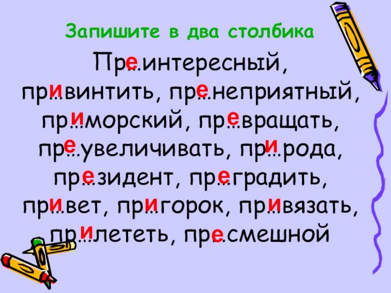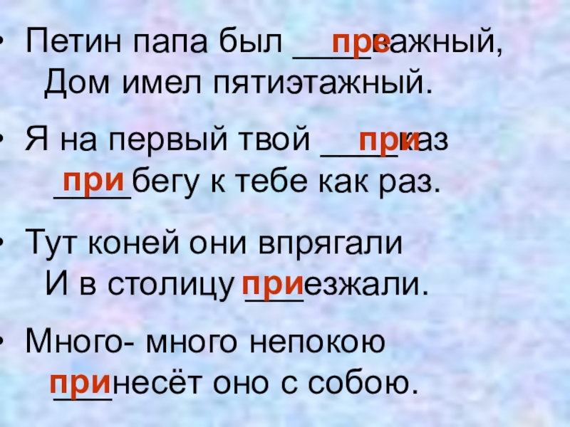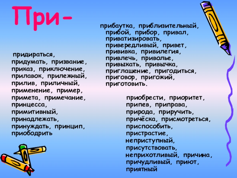 придираться, придумать, призвание, приказ, приключение, прилавок, прилежный, прилив, приличный, применение, пример, примета, примечание, принцесса, примитивный, принадлежать, принуждать, принцип, приободрить