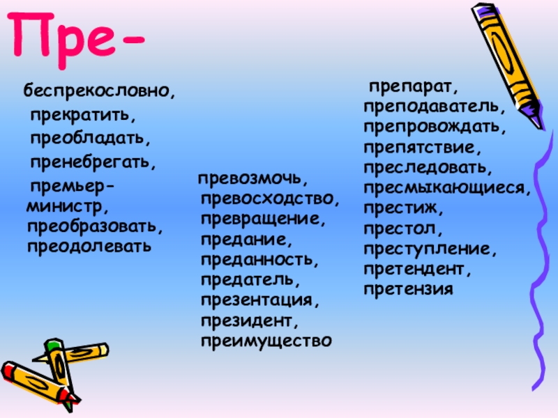 превозмочь, превосходство, превращение, предание, преданность, предатель, презентация, президент, преимущество