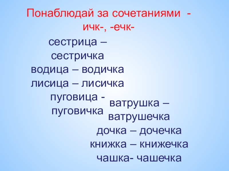Понаблюдай за сочетаниями -ичк-, -ечк-