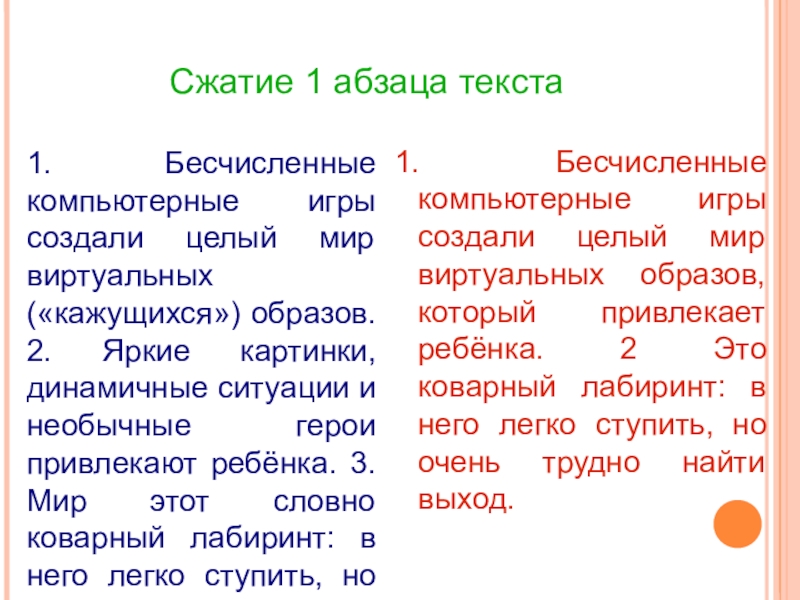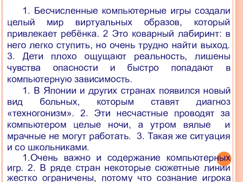 1. Бесчисленные компьютерные игры создали целый мир виртуальных образов, который привлекает ребёнка. 2 Это коварный лабиринт: в него легко ступить, но очень трудно найти выход.