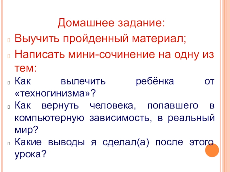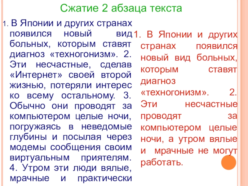 1. В Японии и других странах появился новый вид больных, которым ставят диагноз «техногонизм». 2. Эти несчастные проводят за компьютером целые ночи, а утром вялые и мрачные не могут работать.